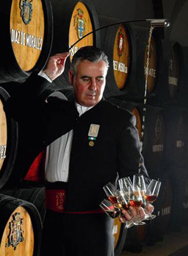 長い柄杓「ベネンシア」を使い、高度な技術でシェリー酒をグラスに注ぐ職人。